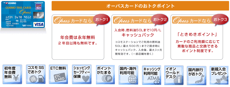 ガソリンカードは各石油会社から発行されていますが、おすすめは年会費無料のコスモザカードオーパスです。コスモザカードオーパスは、会員価格でガソリンを給油出来ます。全国のコスモステーションで使用でき年会費は一切掛りません。ガソリンを給油する時やイオン(AEON)加盟店で使用した場合にポイントも付きます。